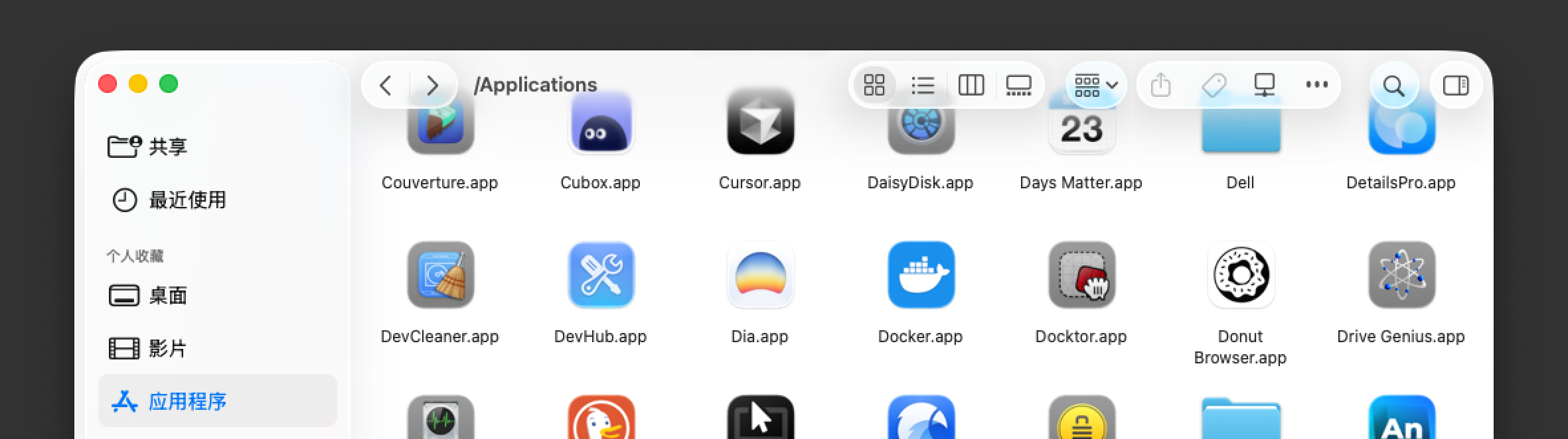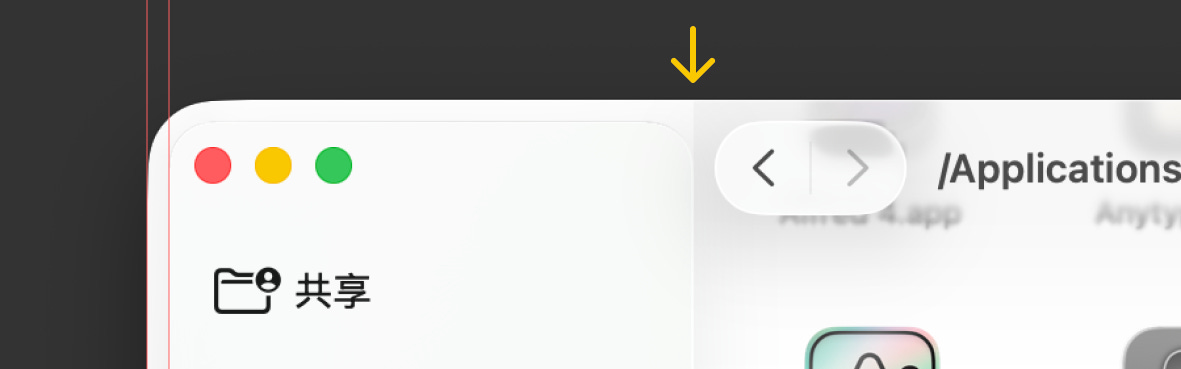 macOS seems to have been caught off guard by this transition. The sidebar and top toolbar haven't been fully adapted, yet they've been pulled along by iOS and iPadOS into this new look, and it's a rather ill-fitting outfit. On light backgrounds, to increase contrast, the opacity of shadows is increased. Additionally, because toolbars cannot afford to have excessive edge spacing and occupy limited space, combined with the overly narrow left and right padding within each tool group, this has resulted in the current awkward situation.