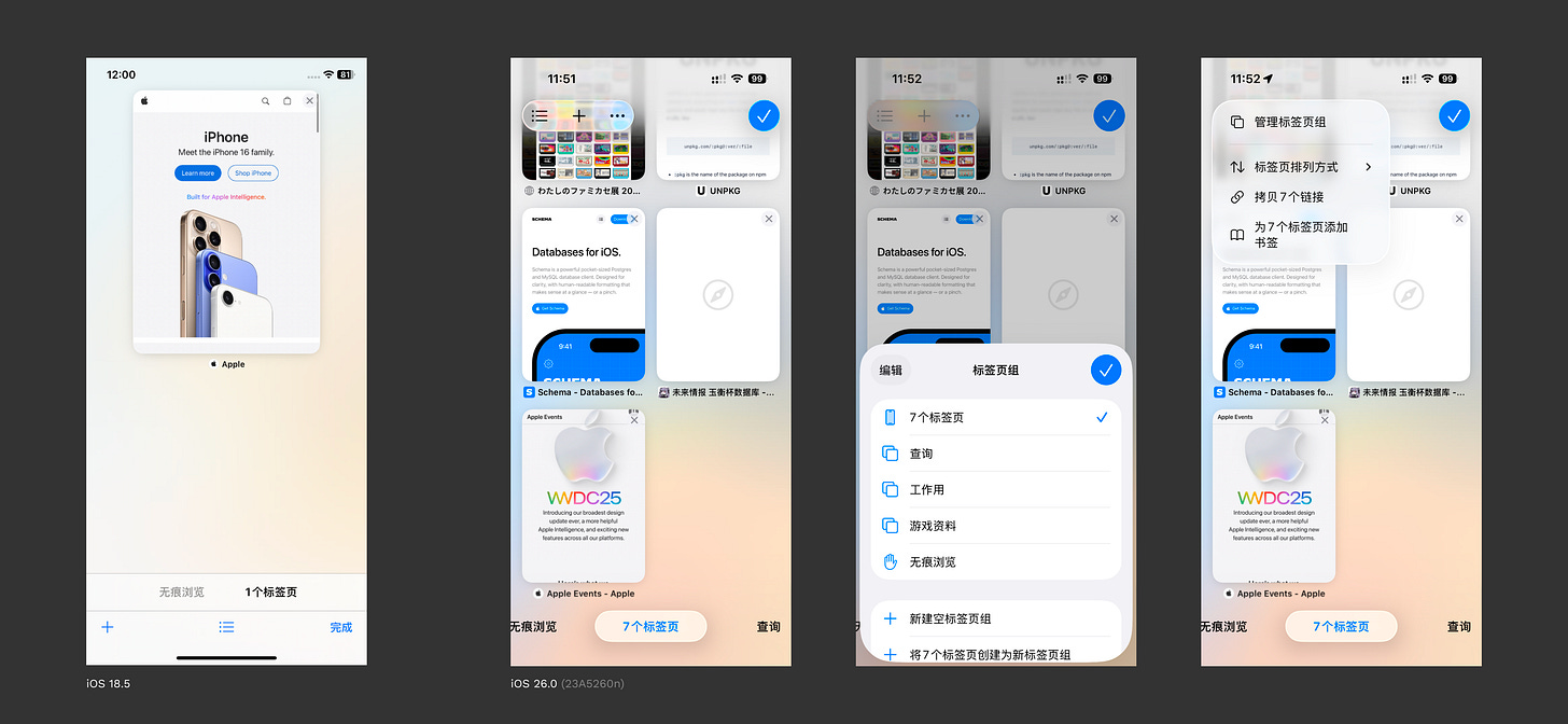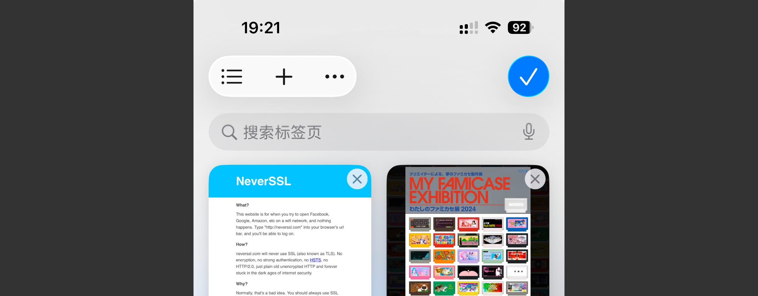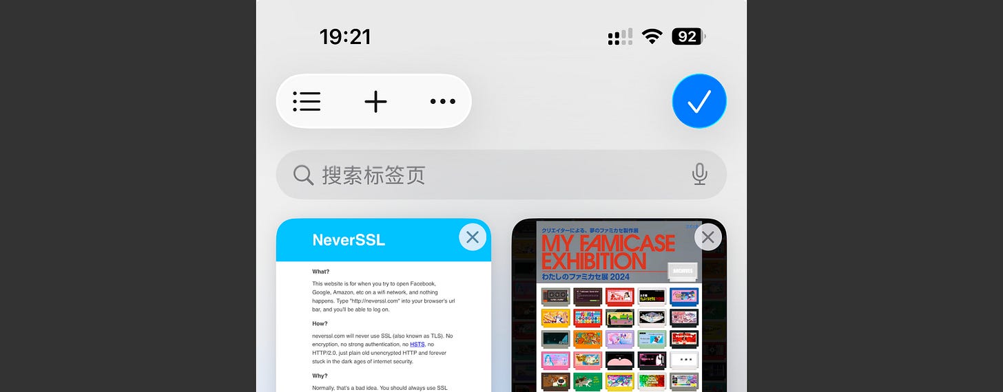 In this interface, the "plus" icon represents creating a new tab, the "list" icon represents tab groups (I still think this icon is not ideal, as it can represent too many things), and "Done" represents returning to the originating page.