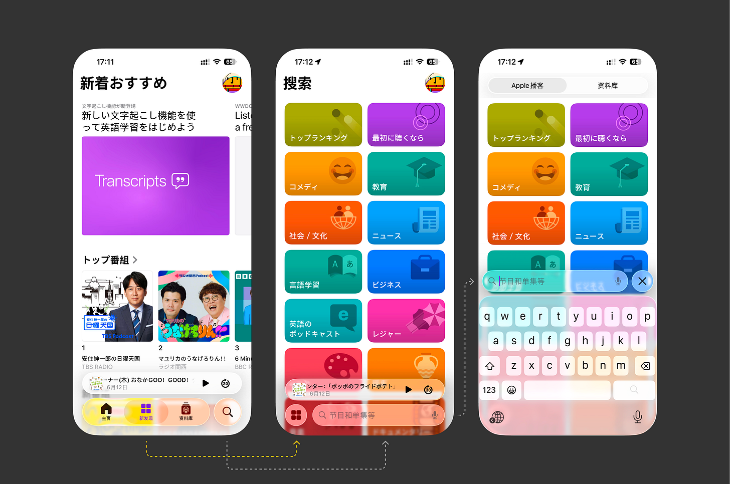 The tab bar and search are now on the same level. When you tap search, only the currently selected tab bar state is displayed on the left (middle image above). Tapping search again enters the search state (right image above), and tapping "X" returns.