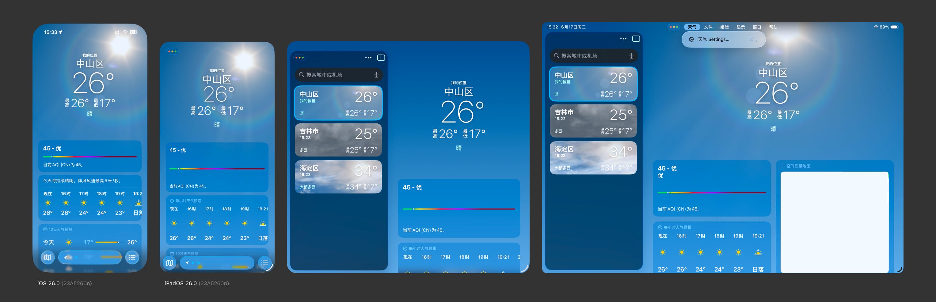 iPadOS 26.0 brings significant changes. It abandons the flashy interactions of previous split-screen modes, adopting a window design more aligned with macOS (→ see Split View for details). Users can freely change the aspect ratio of iPad apps using the handle in the bottom right corner (within certain limits), and window control indicators and menu bars have been introduced.