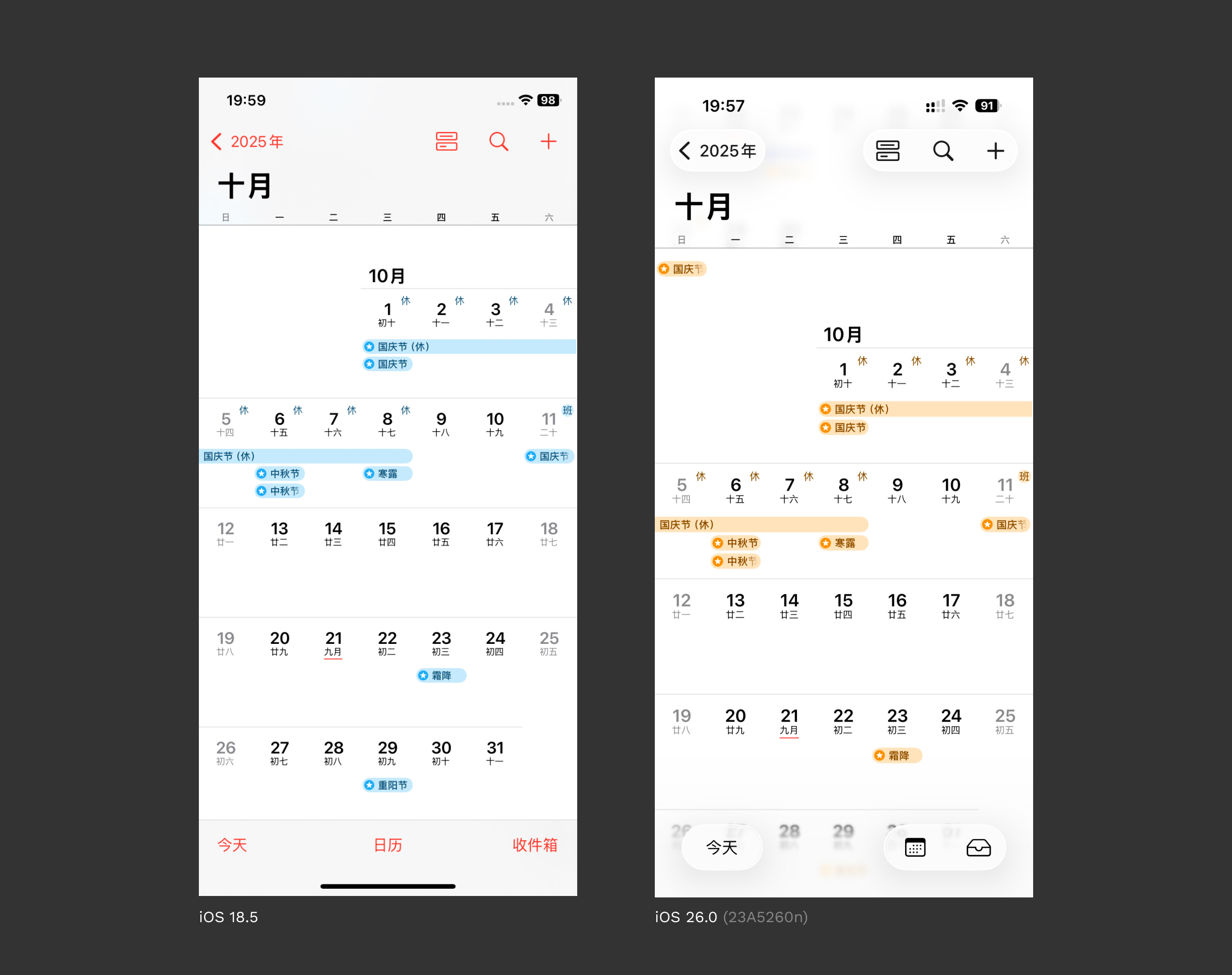 We also observe the application of Scroll Edge Effects at the top and bottom of the Calendar on the right, which are essentially gradient transition effects. Most often, this is the "Soft" effect; on macOS (e.g., in Finder), the "Hard" effect is used to enhance contrast.