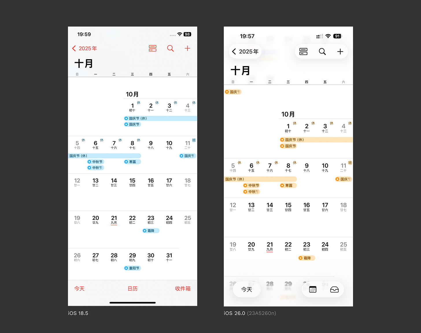Apple advocates for using clear, unambiguous icons to largely replace text (→ detailed in Toolbars. If icons are ambiguous, text can be used (like "Today" on the left). However, it's important to avoid mixing text and icons within a single Liquid Glass element, as this can lead users to mistakenly interpret it as a single functional button.