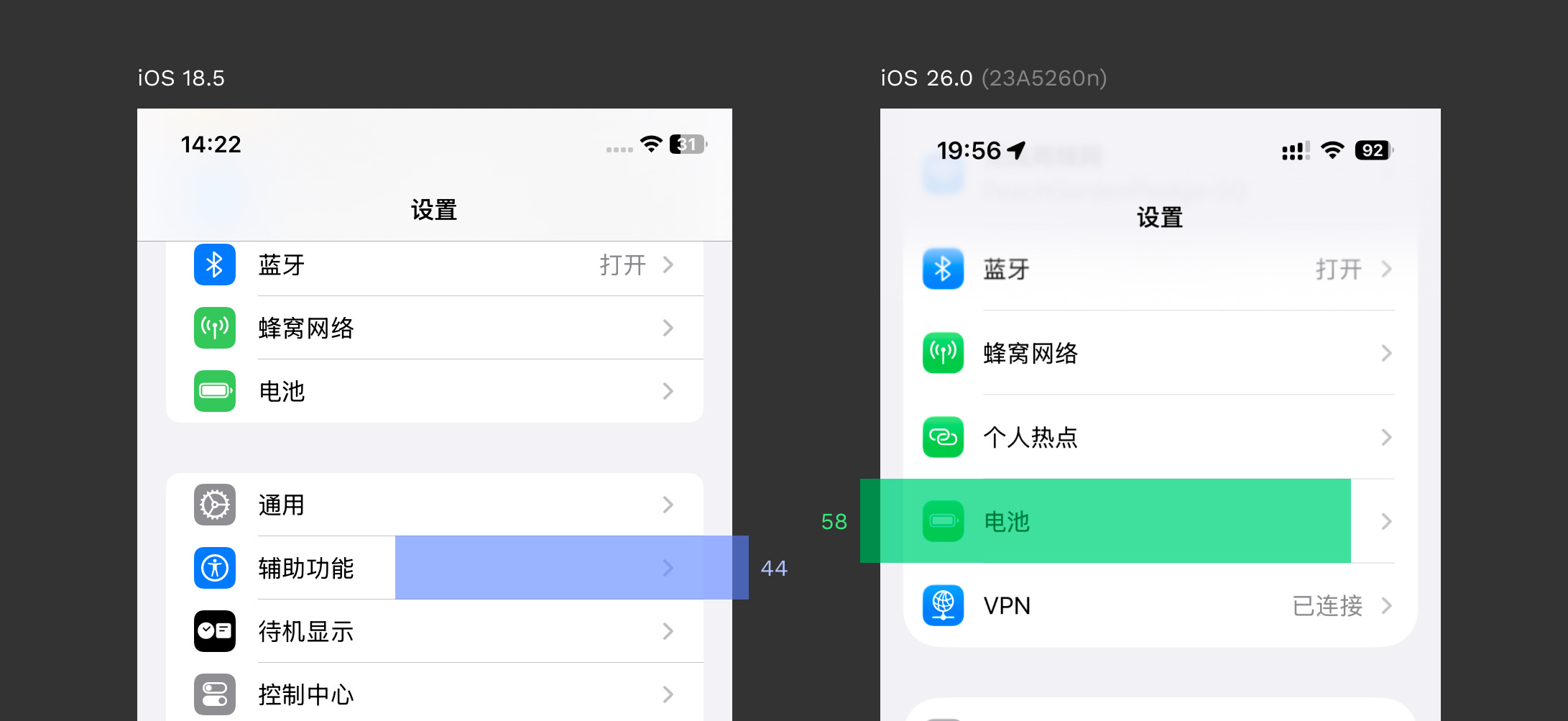 The following screenshots are based on iOS 18.5 (iPhone XR) and iOS 26.0 23A5260n (iPhone 14 Pro) as references for the old and new systems.