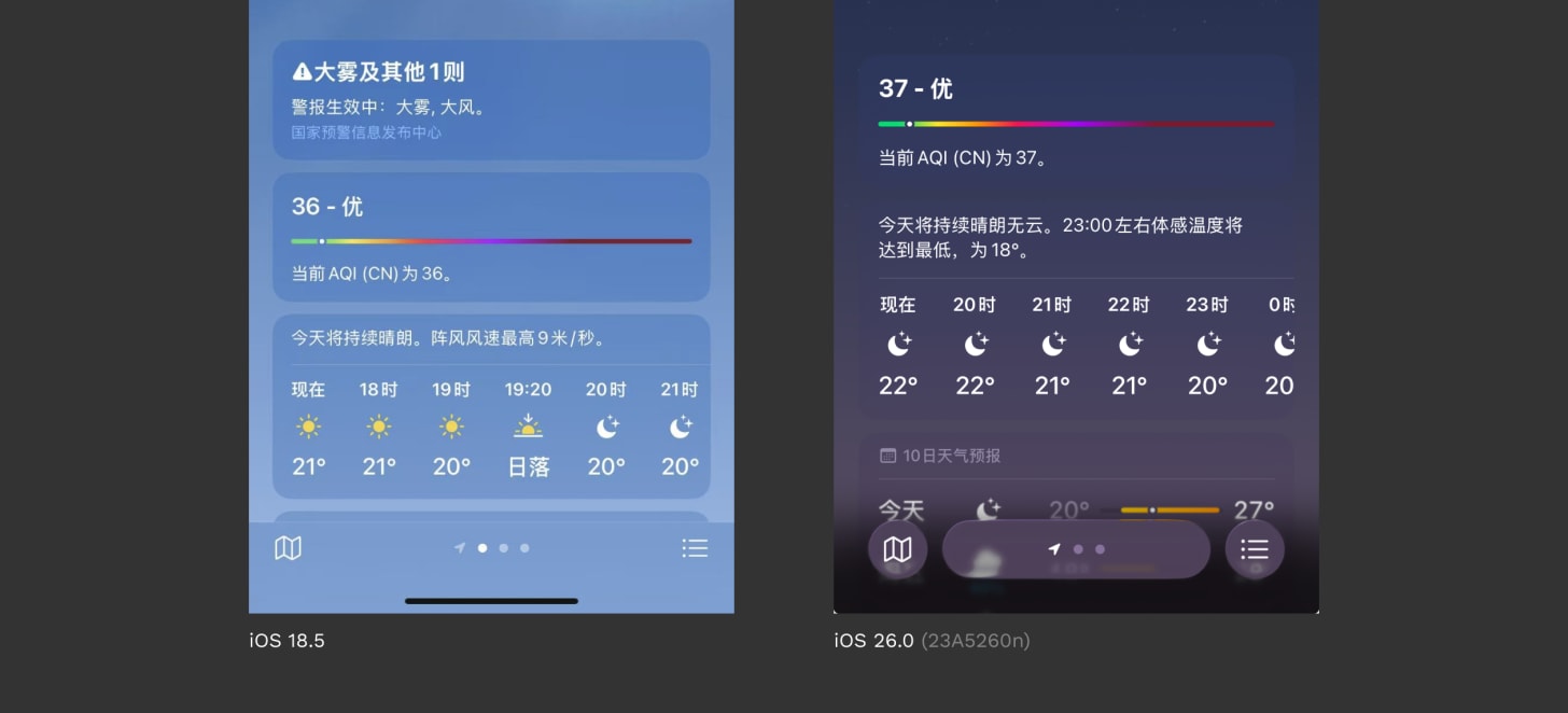 Whether it's the jarringly dark Control Center on iOS or the out-of-place toolbars on macOS, most of Liquid Glass's current visual "missteps" can be attributed to the tight development schedule of Developer Beta 1, preventing the design from achieving its intended effect. Rather than showcasing a brand new visual language, it feels more like a solo showcase for Liquid Glass. While WebGL implementations have existed for some time, Apple's refraction and edge reflection effects are notably refined, striking a preliminary balance between aesthetics and performance. However, when integrated into the interface, background interference becomes a significant issue. In fact, the Liquid Glass material itself seems designed to accentuate background content.